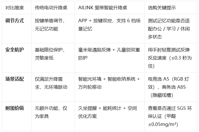 前言:平时用户经常在问如何选择一款升降桌,一张升降桌如何来满足一个家庭的需求和解决用户痛点,今天就出一个购买指南,帮大家梳理一下市场上的升降桌的分类和区别,如何选到自己适合的升降桌,要先了解到,升降桌有电动和智能之分,我们先看看他们的对比,哪个场景更适合您?