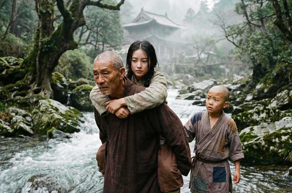 老和尚和小和尚下山化缘,路遇一条河,一位女子不敢过河。老和尚便主动背起女子过了河,放下后继续赶路。