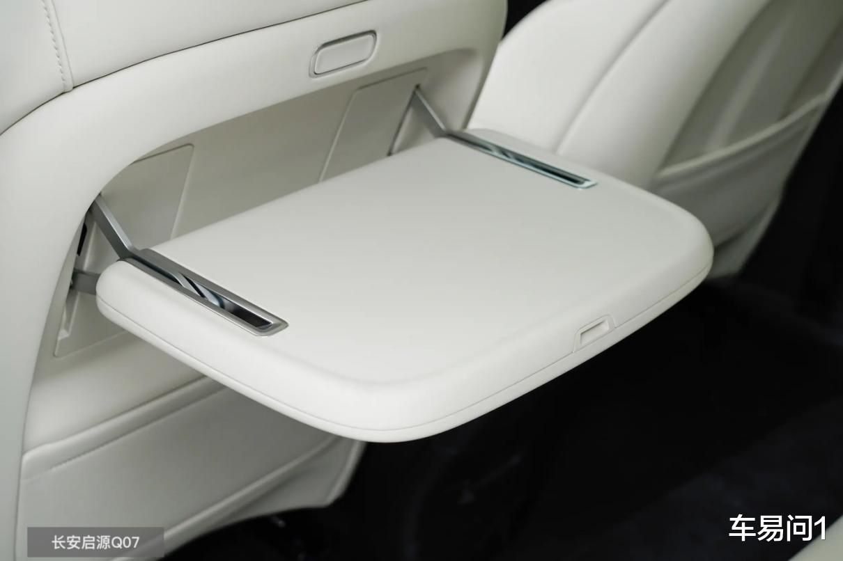 长安启源Q07这边除了有16扬声器沉浸声场外,还在空调部分多了负离子空气净化、对老人小孩比较友好。而副驾提供的带腿托的零重力座椅、前排带有按摩,二排也支持加热通风与电动大角度调节,加上偶尔可以提供用餐、办公等支持的小桌板,应该说在人性化与舒适方面会更到位些。