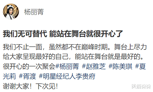 能站在舞台就很开心了。我们不止一面,虽然都不在巅峰时期。舞台上尽力给大家呈现最好的自己,能站在舞台就是最好的。很开心的一次聚会。”看着赵雅芝和杨丽菁的配文,很多网友都感慨时间过得好快,也感谢他们为观众创造美好的回忆。