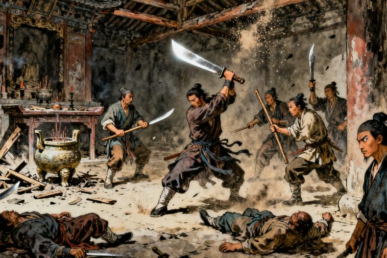 当天夜里,范无救揣着一把大刀,独自摸到了张老虎的巢穴 —— 城外的一座破庙。张老虎早就收到消息,叫手下在庙周围埋伏好,等着范无救自投罗网。范无救刚靠近破庙,就有十几个歹徒冲了出来,挥舞着刀棍朝他砍来。范无救毫不畏惧,大刀一挥,瞬间就砍倒了两人。歹徒们见他厉害,都有些害怕,可张老虎在庙里喊着:“谁能杀了他,赏五十两银子!” 歹徒们一听有赏,又疯狂地冲了上来。