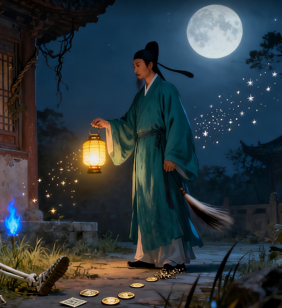 柳生吓了一跳,猛地回头,只见月光下站着一位身着青色道袍的老道长。老道长鹤发童颜,手中握着一把拂尘,眼神清亮,不似常人。柳生定了定神,拱手行礼:“晚辈柳生,听闻此处有《冥府录》,特来寻找。不知道长为何在此?”