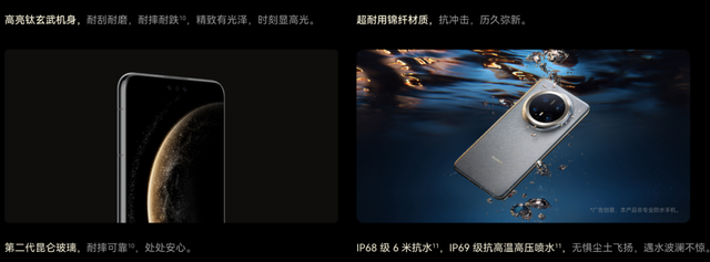 除了通信能力的拉满,华为Mate 70 Pro+使用的高亮钛玄武机身,带来了远超传统材质的抗冲击和抗腐蚀能力,再加上华为第二代昆仑玻璃,其耐摔能力提升至普通玻璃的10倍以上,从容应对日常生活中的意外跌落与刮擦。除此之外,还有IP68级6米抗水、IP69级抗高温高压喷水,拓展了手机的使用边界。