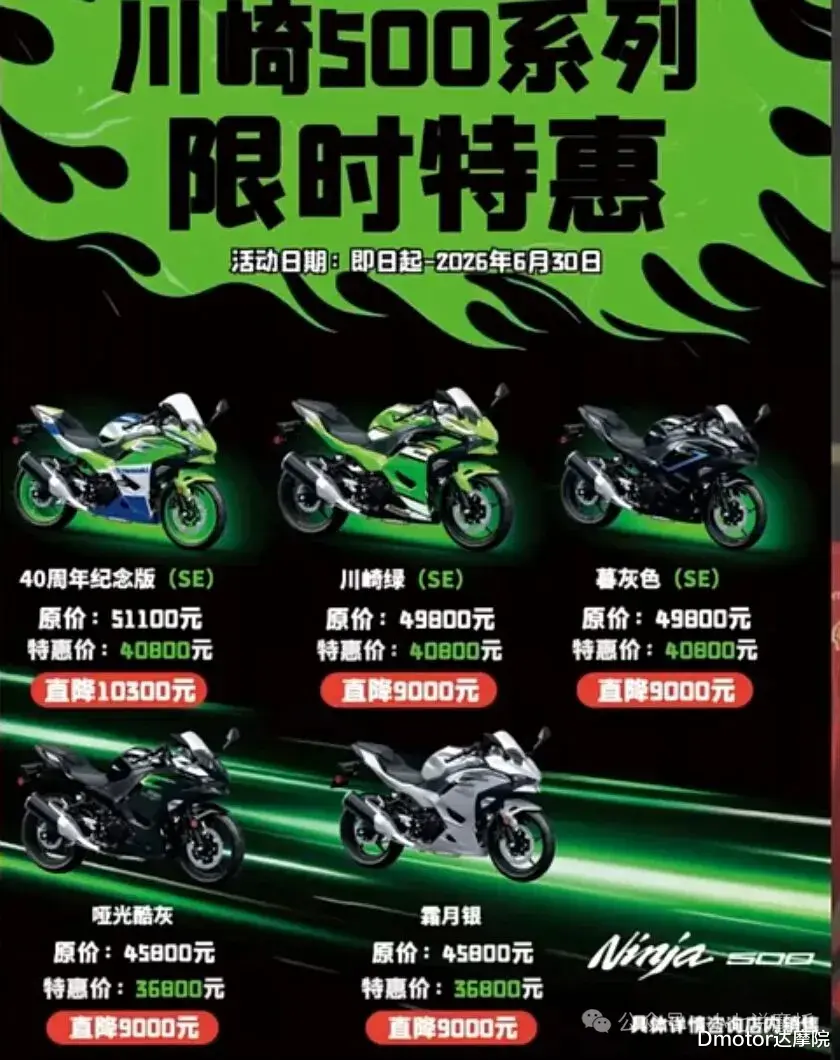 入门仿赛板块,Ninja 500全系参与活动,40周年纪念版特惠价40,800元,普通版最低来到36,800元。