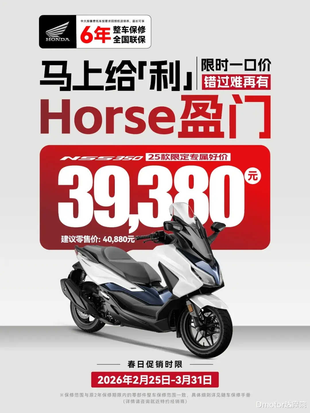 踏板板块依旧是关注焦点,NSS350(佛沙350)首次进入4万以内区间,限时价39,380元,从曾经加价排队,到如今主动让利,这台车的市场角色正在发生变化。