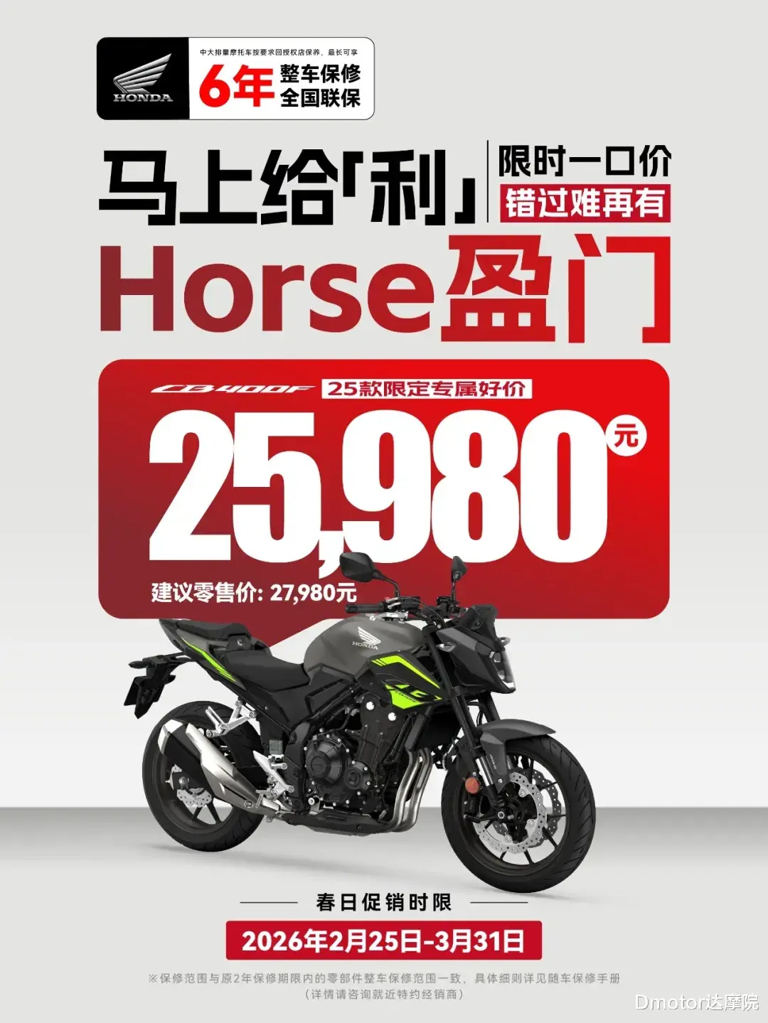 街车方面,CB400F来到25,980元。经历版本升级后,其配置成熟度已高于早期批次,如今价格下调,性价比位置被进一步强化。