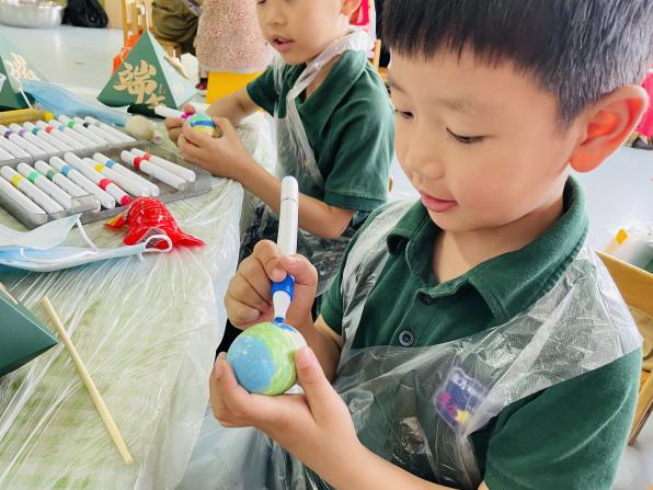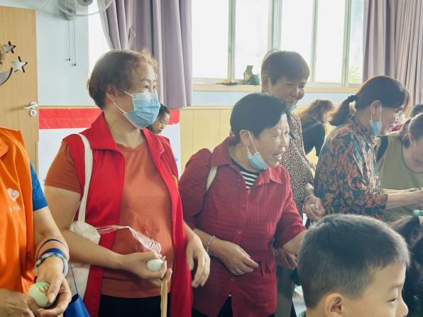 在包粽子的欢乐之余,活动还特别设置了端午鸭蛋彩绘DIY环节。小朋友们化身为“小艺术家”,在洁白的鸭蛋上用五彩的颜料和画笔,尽情挥洒创意。有的画上可爱的粽子笑脸,有的描绘出象征吉祥的龙舟图案,还有的写下稚嫩的“端午安康”、“福”字等祝福语。每一枚彩蛋都承载着孩子们纯真的心意和对节日的美好想象。彩绘完成后,孩子们手捧自己精心装饰的鸭蛋,主动走向现场参与活动的社区阿姨们,将这份独一无二的“端午福蛋”作为节日礼物送给她们,并甜甜地说着祝福的话语。收到礼物的阿姨们惊喜不已,脸上洋溢着幸福的笑容,连声道谢,将自己包好的粽子也送给了小朋友一份,现场充满了浓浓的温情与感动。这份互相传递的的礼物,不仅包含了节日的祝福,更在小朋友和社区长辈之间架起了一座温暖的桥梁。