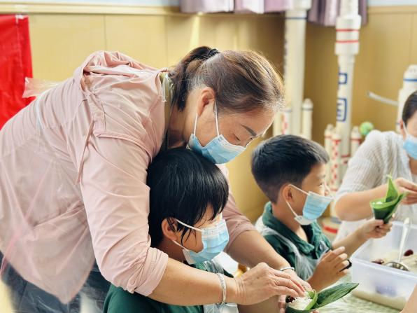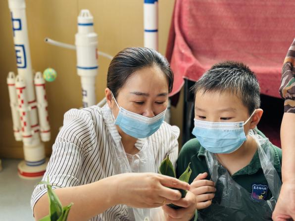 紧接着来自社区的包粽子“能手”们担任起“指导老师”的角色。她们耐心细致地向小朋友们演示包粽子的步骤:如何挑选粽叶、如何折成漏斗状、如何装入适量的糯米和红枣、如何捆扎结实。活动现场充满了欢声笑语,其乐融融。