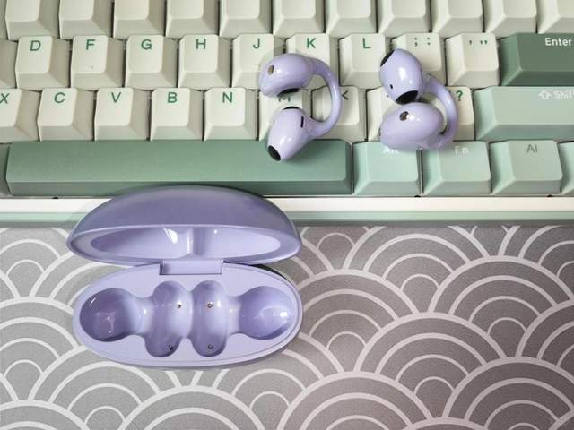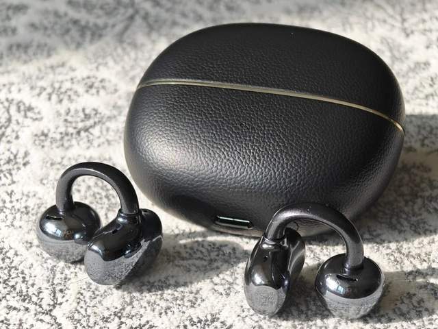这款耳机的耳夹式设计可以让耳朵保持通透的感觉。耳机单耳约 6.3 克,戴在耳朵上感觉很轻,戴着很舒服。耳机的 “C 型” 内桥外部用了高品质 TPU 材质,摸起来柔软亲肤;再加上 12° 黄金夹角设计,既能牢牢贴合耳部,还能带来不错的佩戴体验。