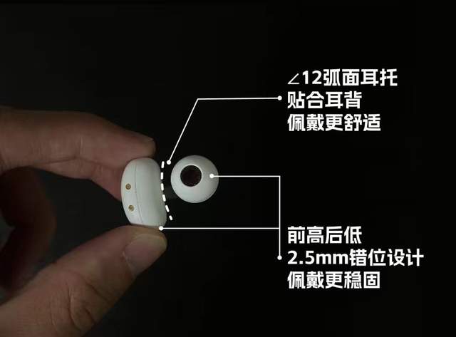 这款耳机的佩戴设计暗藏巧思。它采用前高后低的 2.5mm 错位结构设计,能精准贴合耳道轮廓,确保佩戴时不易滑落。电池部分则被设计成∠12 弧面耳托,可自然服帖于耳背,进一步提升贴合度与舒适度。单耳仅 4.5g的重量,佩戴轻松舒适。
