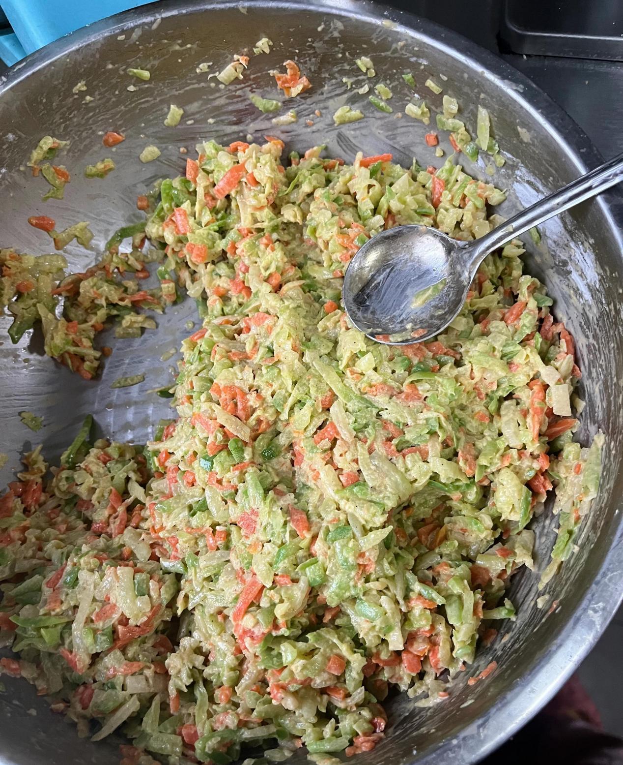 剁好了就该调味了,其实也没啥复杂的,就盐和五香粉就够了,我用的是同仁堂的五香粉,味道挺正的。然后加点淀粉和面粉,这俩得一样多,不然容易散。再打个鸡蛋进去,如果萝卜多的话就打两个。对了,还得加点花生油,这样炸出来更酥脆。搅拌均匀了就可以开始炸了,别搅太久了,不然容易出水。