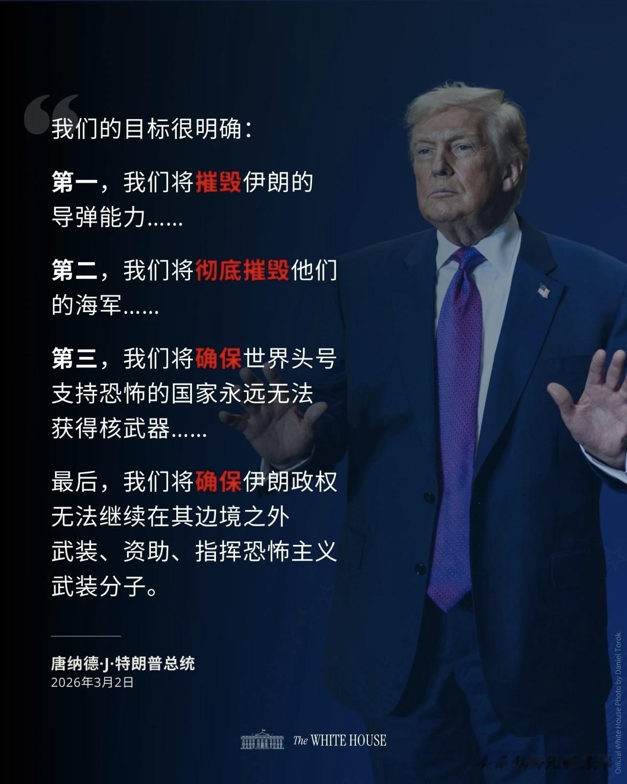 他在白宫抛出四大目标:摧毁伊朗导弹能力、打掉伊朗海军、阻止伊朗拥核、切断境外武装支持。