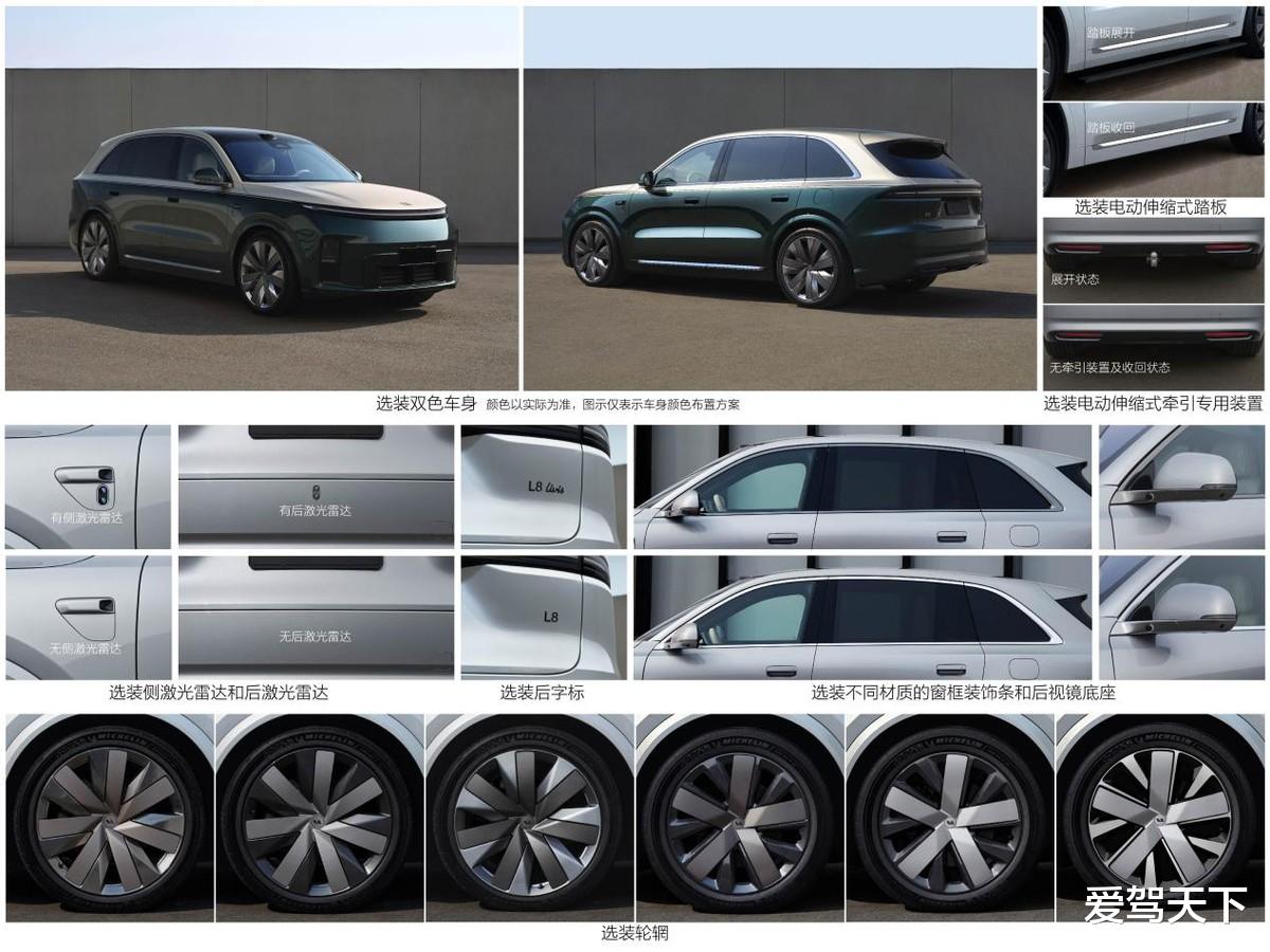 除此之外,理想L8 Livis还将延续新一代理想L9 Livis的侧向和后向激光雷达的方案,同时提供双色车身可选。从申报信息来看,理想L8 Livis还提供了多种不同样式的轮毂,但说实话,这些轮毂之间的变化并不大,对整车外观的提升效果有限。
