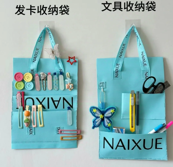 奶茶袋子,外卖袋子,也可以改造墙上收纳袋,将袋子拆开之后,另一边剪成小块,然后缝在上面,或者使用订书器装订在上面即可。