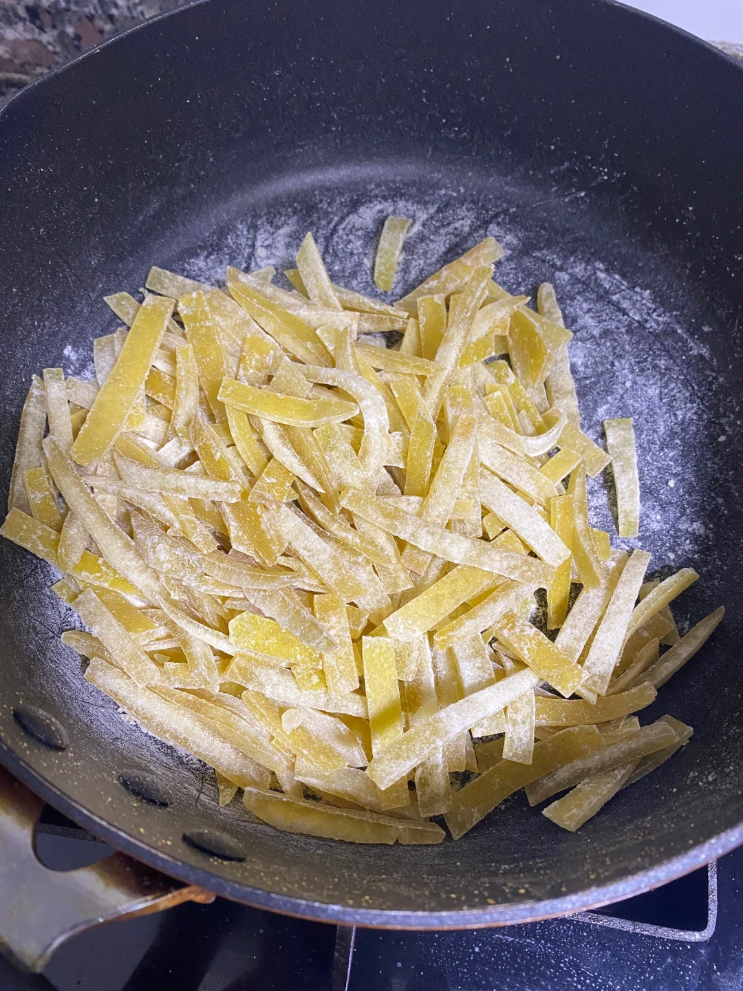 柚子皮用盐搓洗干净之后,去掉白瓤,然后切成条,放在盐水中浸泡一个晚上,能够去除咸苦的味道。开水放入柚子皮焯两分钟,然后反复清洗,三四遍之后捏挤水分。