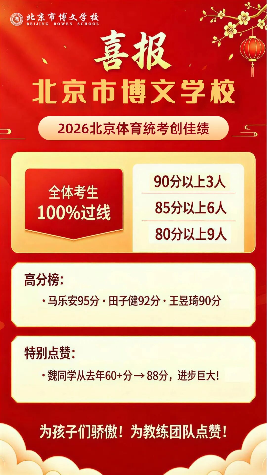 在4月11日—12日举行的2026年北京市普通高校招生体育专业统一考试中,北京市博文学校高三体育考生全员 100% 过线,全部达到合格标准,成绩喜人。