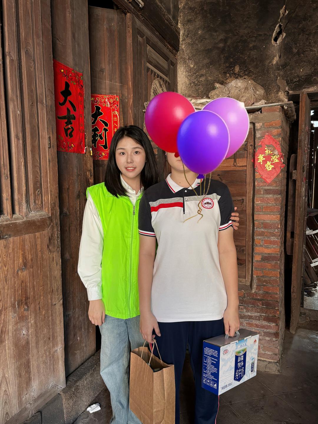 福延公益志愿者总队长汤琴与慰问困难学生在一起,鼓励学生好好学习。