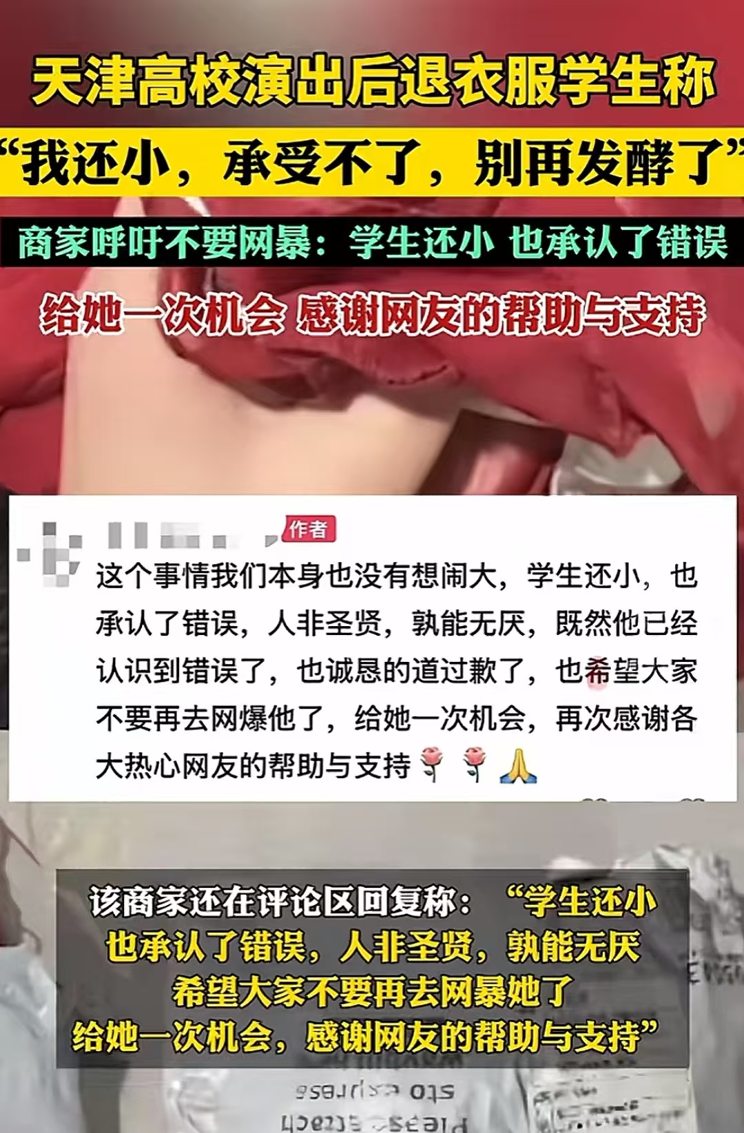 近日,一则天津高校演出后退衣服事件引发了广泛关注。学生称“我还小,承受不了,别再发酵了”,商家呼吁不要网暴,因为学生还小且已认错。然而,年龄小虽可能值得一定程度的体谅,但绝不应成为犯错后逃避责任的借口。