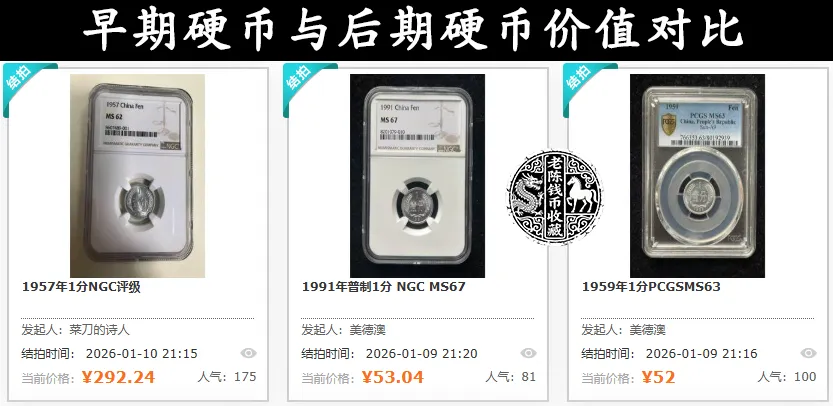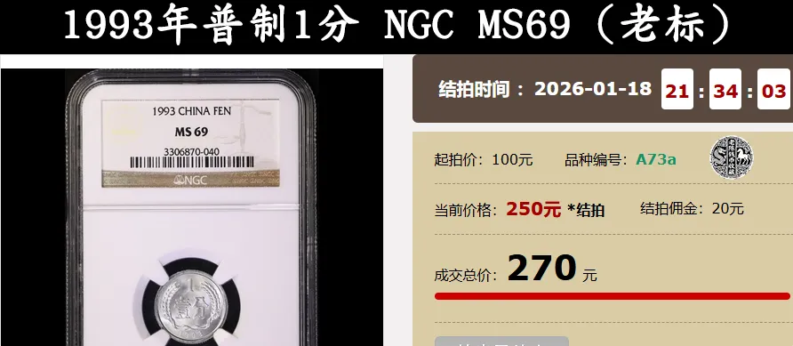 在2026年1月18号的现代钱币月拍中,就只拍出了270元而已。不过这枚1分硬币还是挺值得说说,不仅是老标评级(文字居中),品相也很有亮点。