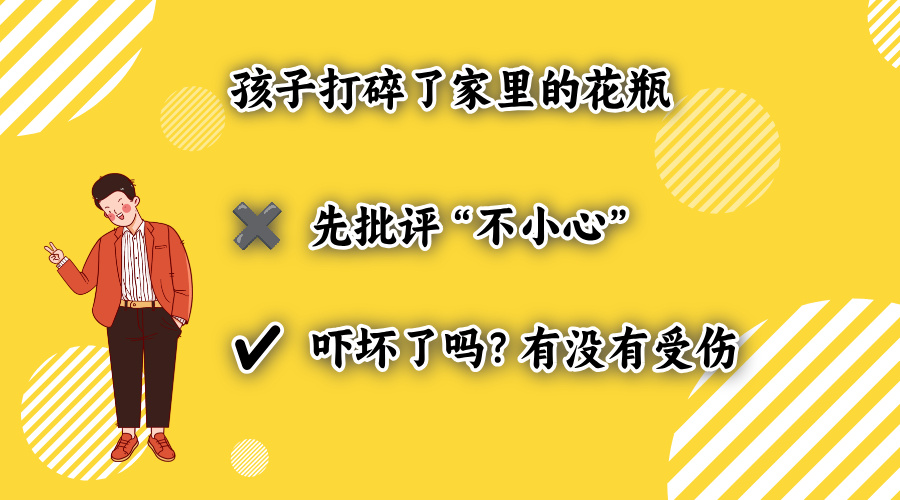 孩子打碎了花瓶,不要先批评“不小心”,而是可以先问问孩子“吓坏了吗?有没有受伤”,等孩子情绪稳定以后,再一起分析如何避免的问题。