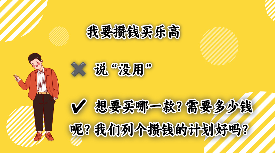 孩子说要“攒钱买乐高”,家长先别急着否定“没用”,而是可以尝试问问“想要买哪一款?需要多少钱呢?我们列个攒钱的计划好吗?”