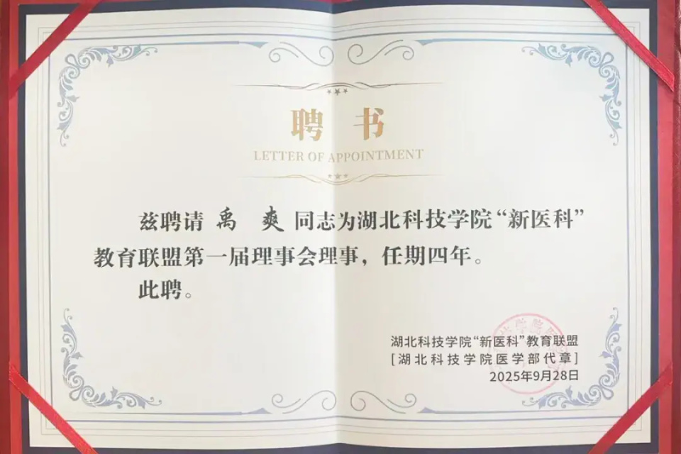 会议上,禹爽院长受聘为湖北科技学院“新医科”教育联盟第一届理事会理事。这一聘任,为联盟汇聚了来自临床一线的专业力量,将助力联盟在医教协同等工作中,更好地结合临床实际需求,推动医学教育高质量发展。
