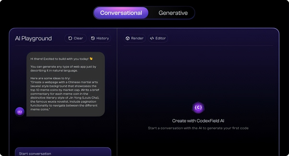3. AI PlaygroundAI Playground 是 CodexField 生态的创作与创新核心,为开发者与创作者提供一个集模型调用、AI 应用生成、内容创作与二次开发于一体的开放平台。它与底层的 Gitd 与 Greenfield 网络深度联动,使用户能够直接在浏览器中访问算力、调用模型,并在链上实现作品的即时存储与确权。无论是生成文本与图像,还是搭建完整的 AI 应用,用户都能在同一环境中完成创作、测试与发布,形成从灵感到上架的全流程闭环。