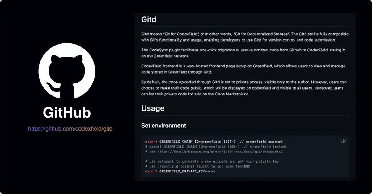 通过 Gitd,CodexField 将“版本管理”从中心化仓库迁移到去中心化环境中,并在此基础上构建了智能化的同步与迁移功能。例如,CodeSync 插件允许开发者一键将 GitHub 仓库内容同步至 CodexField 网络,实现无缝过渡与持久化存储。与此同时,CodexField 还提供了基于 Greenfield 托管的 Web 前端界面,使开发者能够在浏览器中直接查看、管理和发布自己的项目仓库。