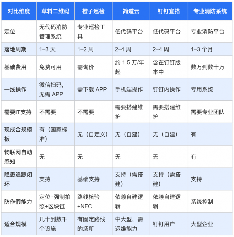 评测范围覆盖:草料二维码、橙子巡检、简道云、钉钉宜搭、专业消防管理系统。选型逻辑按"从轻到重"排列——规模越小、预算越有限的团队,越往前看。