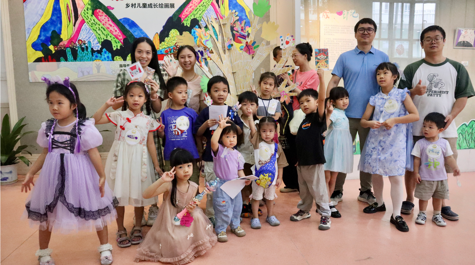 “共创成长树”互动活动:画展首日特别策划了亲子互动环节。15组6-10岁的亲子家庭通过通过"大手画小手"共同创作,将涂满星空的手掌剪影挂上枝头,共同创作了一棵承载着成长回忆与祝福的“成长树”。 一位家长在活动后感慨:"和孩子一起解读乡村小伙伴的画作,是我们收到最珍贵的成长课。