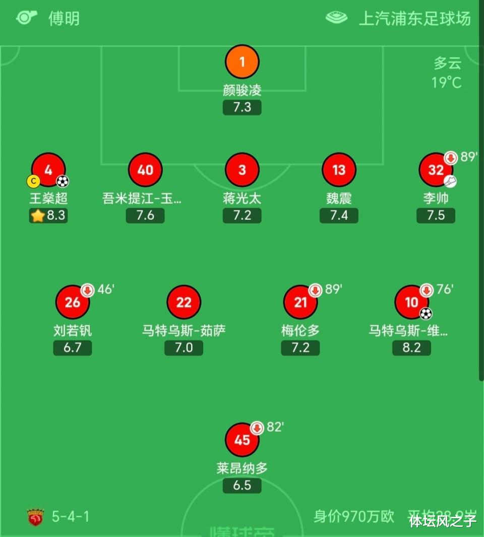 在海港其他首发球员中,维塔尔得到了8.2分,吾米提江拿到了7.6分,李帅7.5分,魏震7.4分,颜骏凌7.3分,蒋光太和梅伦多均拿到了7.2分,如萨7.0分,刘若钒6.7分。