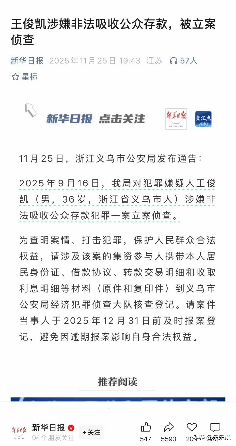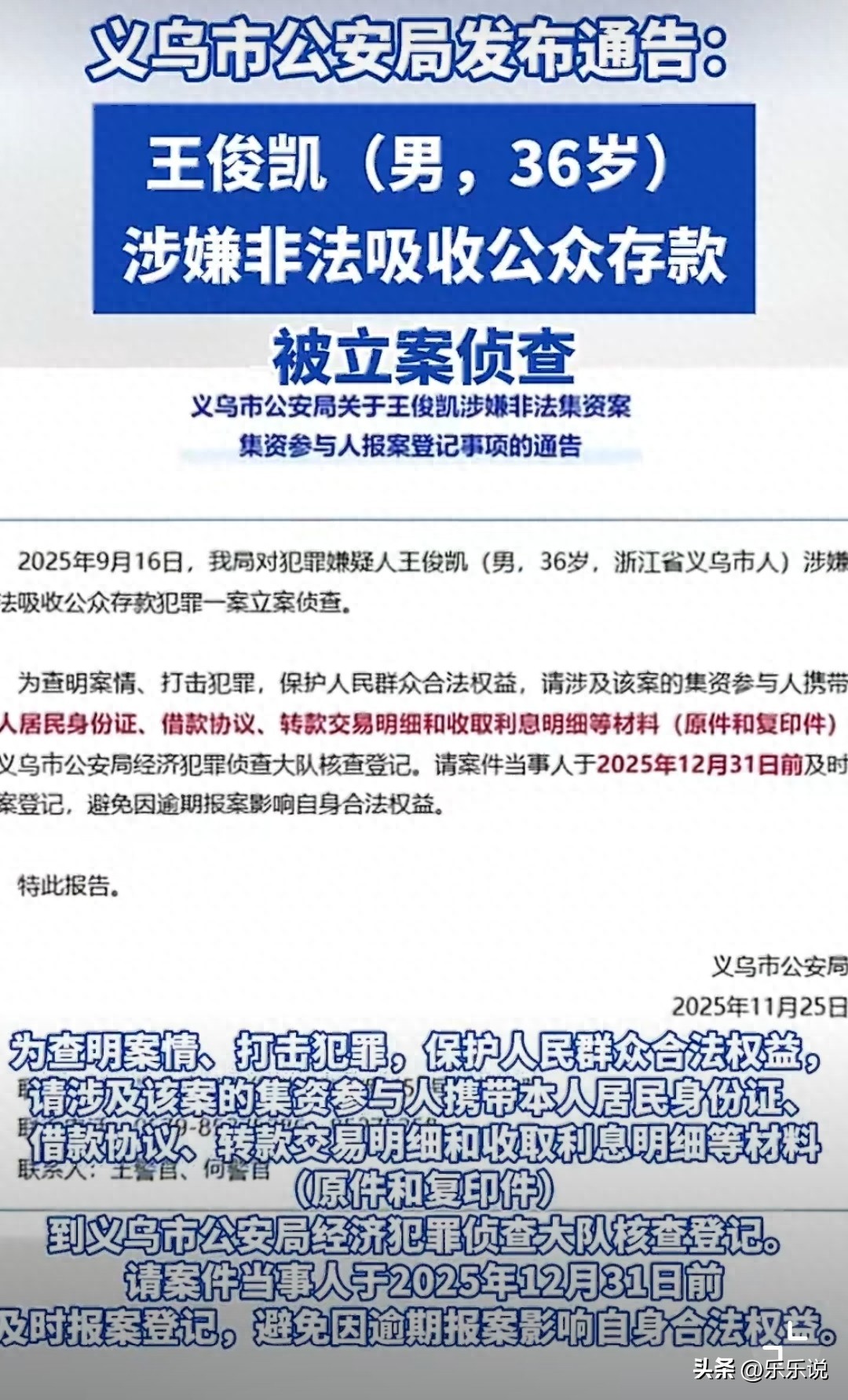 这起事件的源头是义乌市公安局11月25日发布的一则案件通报。警方在通告中明确指出,9月16日已对犯罪嫌疑人王俊凯(男,36岁,浙江省义乌市人)涉嫌非法吸收公众存款犯罪一案立案侦查。