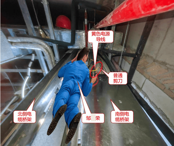 在其他装修区域的王某随即赶来并进入吊顶,发现邹某荣头朝东,顺着天花板桥架方向趴在三列桥架上面,头枕着左手,右手握着剪刀,剪刀口夹着一根已断开的黄色电源导线,未戴手套、未戴安全帽、着运动鞋,身体东侧的风管上有一顶安全帽。