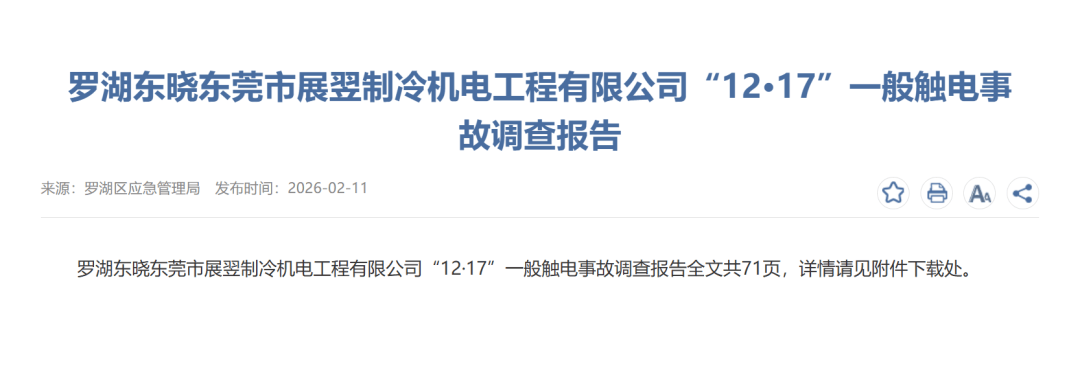 近期,罗湖区应急管理局公布《罗湖东晓东莞市展翌制冷机电工程有限公司“12·17”一般触电事故调查报告》。调查报告显示,2025 年12 月17日15时52分许,罗湖区东晓街道辖区布心路3006号宇宏大厦18层发生一起触电事故,造成1名施工作业人员死亡,直接经济损失为人民币129.15万元。