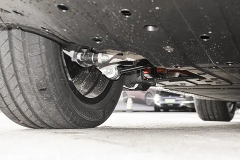 底盘方面,阿维塔07标配前双叉臂+后H臂多连杆独立悬架,悬架材质采用硅镁铝合金,官方表述其可降低簧下质量、提升动态稳定性。实测显示,车辆通过大坑洼路面或减速带时,悬架能快速抑制车身弹跳,无明显二次回弹,路面颠簸过滤效果较好;过弯时悬架对车身的支撑性充足,车身跟随性较强。