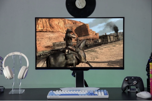 先看控光本身,它搭载了2304个万象分区,通过“一区顶多区”的控光能力,让每一块区域的亮度都能被精准控制。比如在《荒野大镖客2》的白天场景中,阳光直射下的岩壁、地面和列车都处在高亮环境,但画面不会出现一片发白。远处山体的纹理依然清晰,岩石的层次感很明显,沙地和草丛的细节也能分辨出来。人物骑马时,皮革、金属等材质在阳光下有明显的反光层次,但不会刺眼或溢出;列车行进时的烟雾、光影过渡也很自然。亮的地方有细节,远的地方有层次,整个画面既通透又立体,这种表现才更接近真实环境的观感。