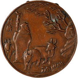 以“苏武牧羊”历史典故为核心图案,刻画苏武手持节杖、身着古装,在北海(今贝加尔湖)畔牧羊的场景。画面中一簇小草、两枝枯树、三只温顺的小羊旁面容惆怅的拄杖长须牧羊老人驻足南望,远处几行南归的大雁从空旷的天空掠过。寥寥数笔勾勒出了“苏武牧羊,勿忘国耻”的历史故事。苏武是汉朝的使者,被匈奴扣留并流放去牧羊。匈奴威胁他,只有公羊生仔才放他回国。但苏武坚守忠诚,不抛弃不放弃,掘鼠粮、食野果,与羊群为伴,度过19年的苦难成功返回汉朝。