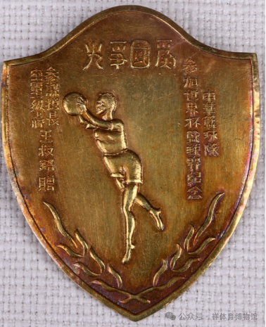北京祥体育博物馆收藏的中华篮球队参加世界杯篮球赛纪念“为国争光”金质徽章可作为不可多得的历史物证。这枚金质盾形纪念章,正面中部浮雕有正在投篮的运动员形象,上部刻有“为国争光”的口号,右侧为“中华篮球队”、“参加世界杯篮球赛纪念”等字样,左侧则是“参谋总长、空军一级上将王叔铭赠”。此徽章的“主人公”钱大钧、王叔铭都是国民党高级将领。钱大钧在台湾多个体育组织任职,并多次带队参加国际赛事,王叔铭曾担任“体育总会会长”。该纪念章是二人对出征第三届男篮世锦赛的中华台北队获得世界第四的好成绩的褒奖。我们讲究以物证史、以物叙史,而体育收藏品有时候真的能够揭开历史的真相。