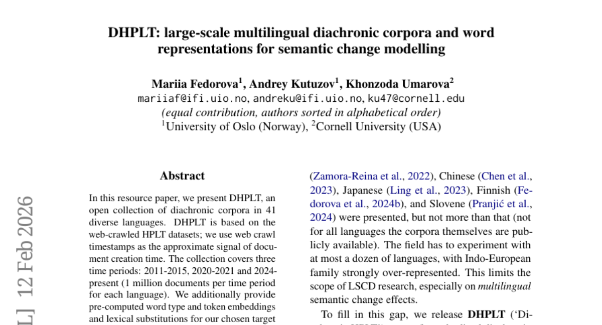 这项由挪威奥斯陆大学联合美国康奈尔大学的研究发表于2026年2月的arXiv预印本平台(论文编号:arXiv:2602.11968v1),感兴趣的读者可以通过该编号查找完整论文。这次研究发布了一个叫作DHPLT的全新语料库,就像为全球41种语言建立了一个超级历史档案馆,专门记录词汇在不同时代的含义变化轨迹。