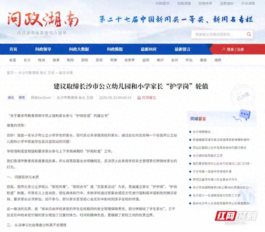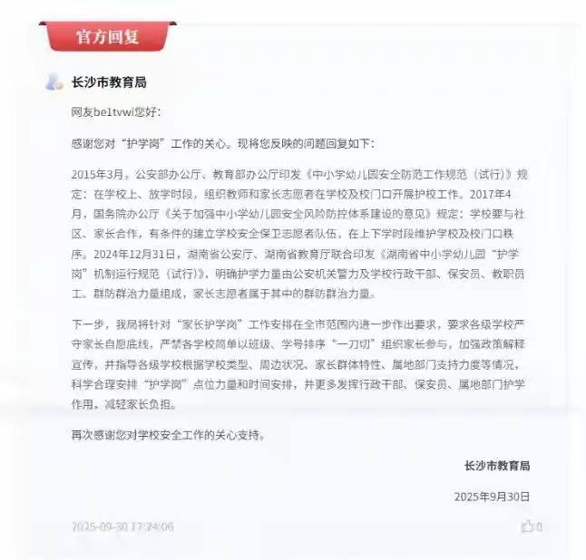 面对这些争议,长沙市教育局近期给出回应,明确表示护学岗应坚持自愿参与原则,学校不得强制要求家长轮值。