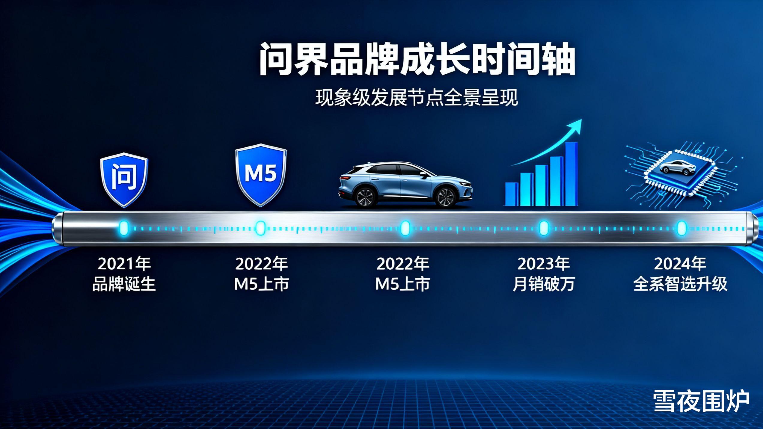 产品矩阵与市场爆发M5 (2021年底): 首款车型,中型增程式SUV,鸿蒙座舱惊艳市场,87天销量破万。M7 (2022年中): 中大型SUV,2023年改款后引爆市场,单月交付突破3万辆,一度超越理想L系。M9 (2023年底): 全尺寸旗舰SUV,售价超50万,集ADS 3.0、百万像素大灯、玄武车身于一身,4个月销量破1.5万。2024年问界品牌累计销量超24.8万辆,跻身新势力前三。
