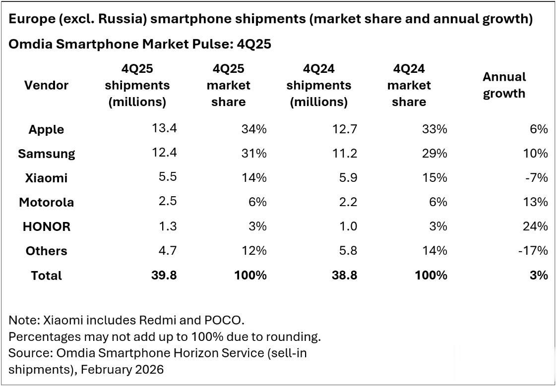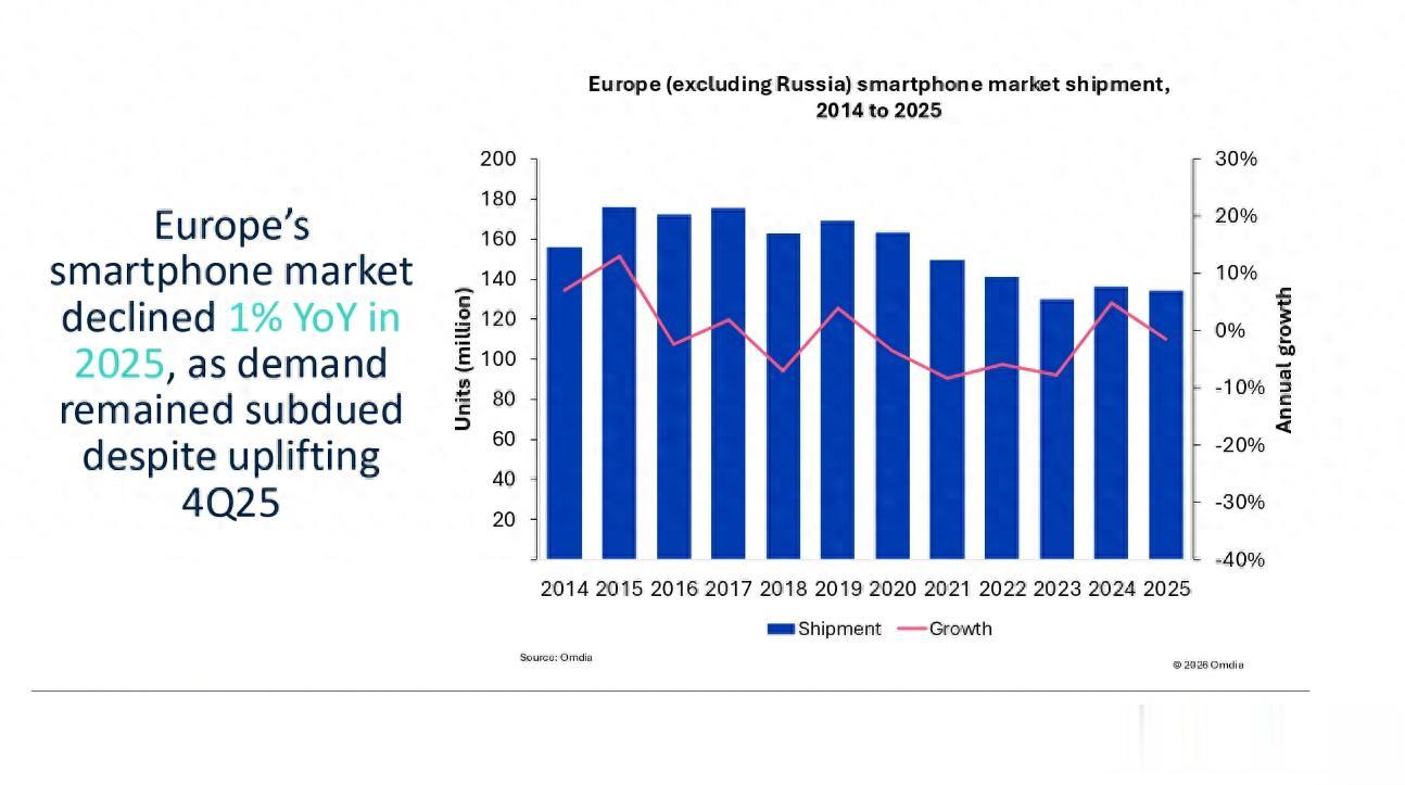 2026 年 2 月 23 日,全球知名市场研究机构 Omdia 发布 2025 年欧洲智能手机市场研究报告,数据显示,受市场需求低迷以及欧盟生态设计、USB-C 统一接口等新规落地的双重影响,欧洲(不含俄罗斯)智能手机市场出货量同比下滑 1% 至 1342 万台,成为充满变革的一年。不过在整体遇冷的市场环境下,苹果与荣耀逆势斩获创纪录市场份额,三星依旧稳坐头把交椅,头部厂商的格局也迎来了新的变化,而差异化竞争则成为中小厂商突围的关键。