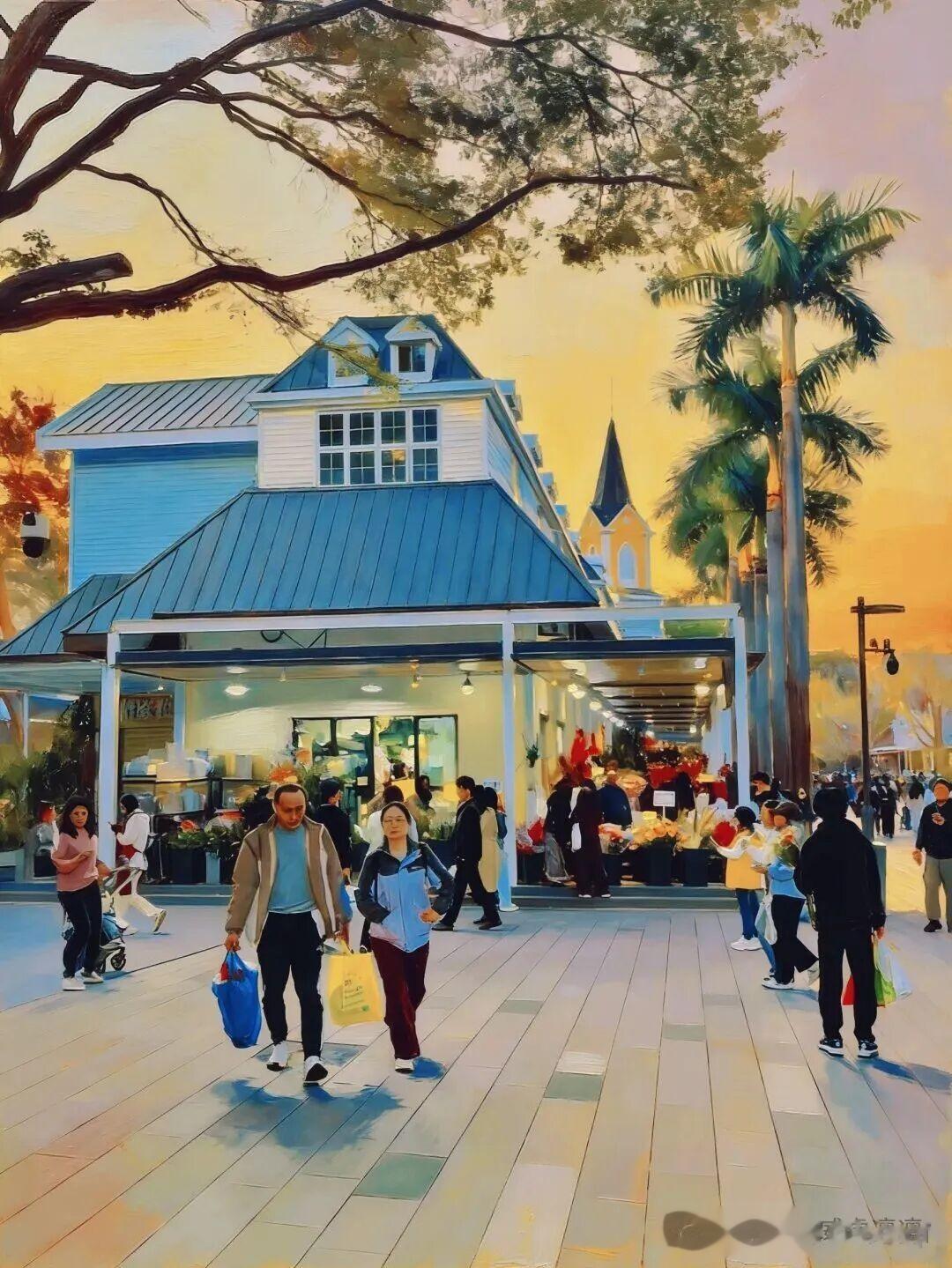 太阳渐渐西斜,给小镇的尖屋顶描上了金边。穿粉衣服的女士坐在长椅上刷手机,脚边的购物袋里,一支康乃馨斜斜地探出头来。