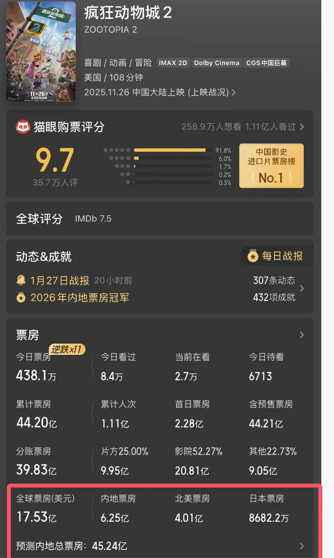 刚才说到日冠易主了,没有错,接替《重返寂静岭》日冠的正是这一部都上映了两个多月的《疯狂动物城2》。