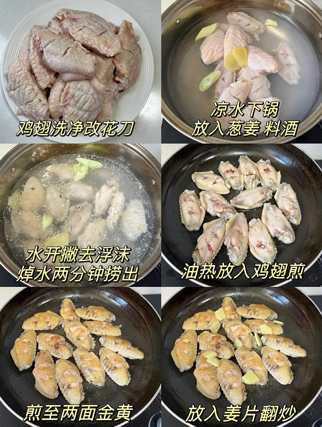 接下来便是烹饪的重头戏,通过煎制锁住水分,赋予鸡翅焦香的口感。起锅烧油,待油温升至六七成热时,将沥干水分的鸡翅小心放入锅中。保持中小火慢煎,期间适时翻面,直到鸡翅两面都呈现出诱人的金黄色,表面微微焦脆,内部水分却被牢牢锁住。此时,放入几片姜片增香,淋入适量生抽提鲜,加入少许老抽上色。快速翻炒,让每一块鸡翅都均匀地裹上酱油的色泽,此时空气中已经弥漫出浓郁的酱香。随后,倒入准备好的可乐,液体的量最好能没过鸡翅,盖上锅盖,转中小火慢炖十五分钟。