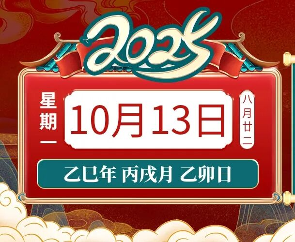 2025年10月13日,星期一,农历八月廿二 (乙巳年丙戌月乙卯日),法定工作日。