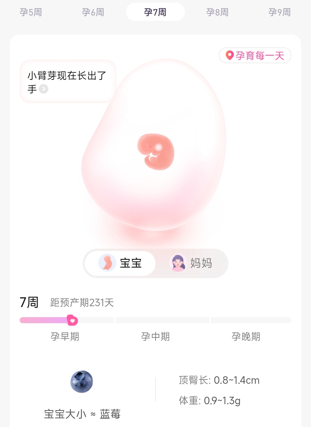回来后,为了学习孕育知识,我在手机上下载了孕育方面的APP。看到7周的胎宝宝已经跟蓝莓一样大了,这个形象的比喻,真的太可爱了!同时,感叹生命的神奇,从受精卵慢慢变成一个胎儿,这是多么奇妙的过程呀!