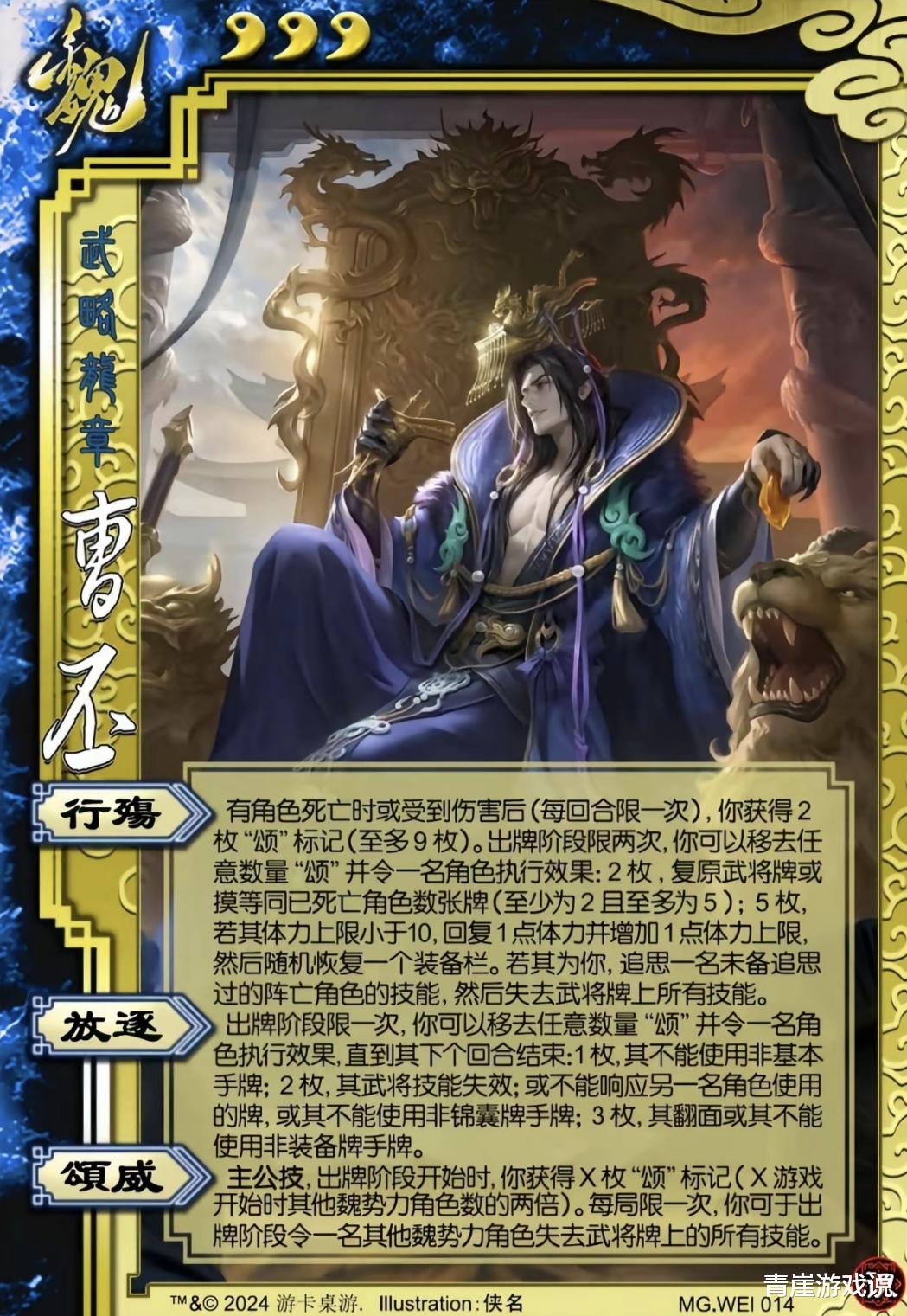 2024年是群星璀璨的时代,有谋关羽、神鲁肃、谋诸葛亮……但这一年最超模的武将还是未削弱的谋曹丕。左手【放逐】右手【颂威】,开局就能限制死场上两位角色,后期更是依靠【行殇】发育。说句夸张一点的话,即便是神荀彧这种太上皇,被谋曹丕一个【放逐】,也得顷刻变成跳梁小丑!