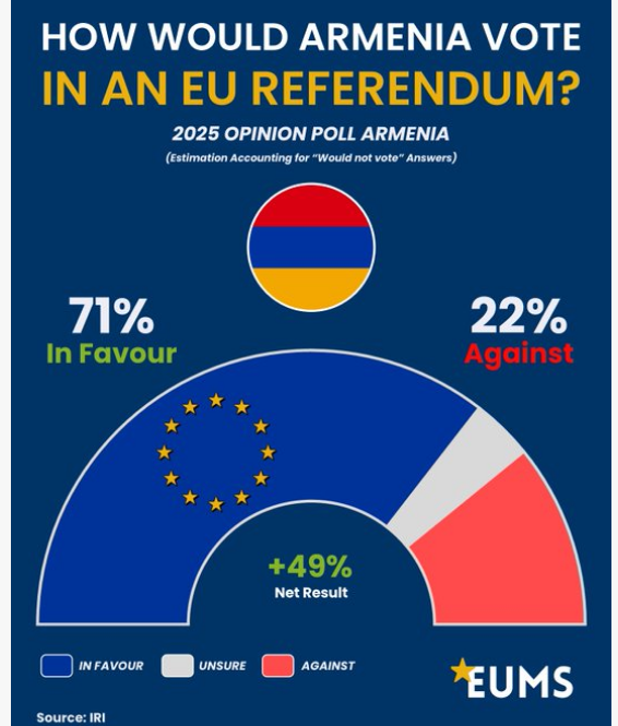 最新民调显示,71%的亚美尼亚公民支持加入欧盟,只有22%的选民反对。相对于三年前,“赞成”一方的净支持率大幅上升了49%。“脱俄入欧”正式成为亚国的主流民意。