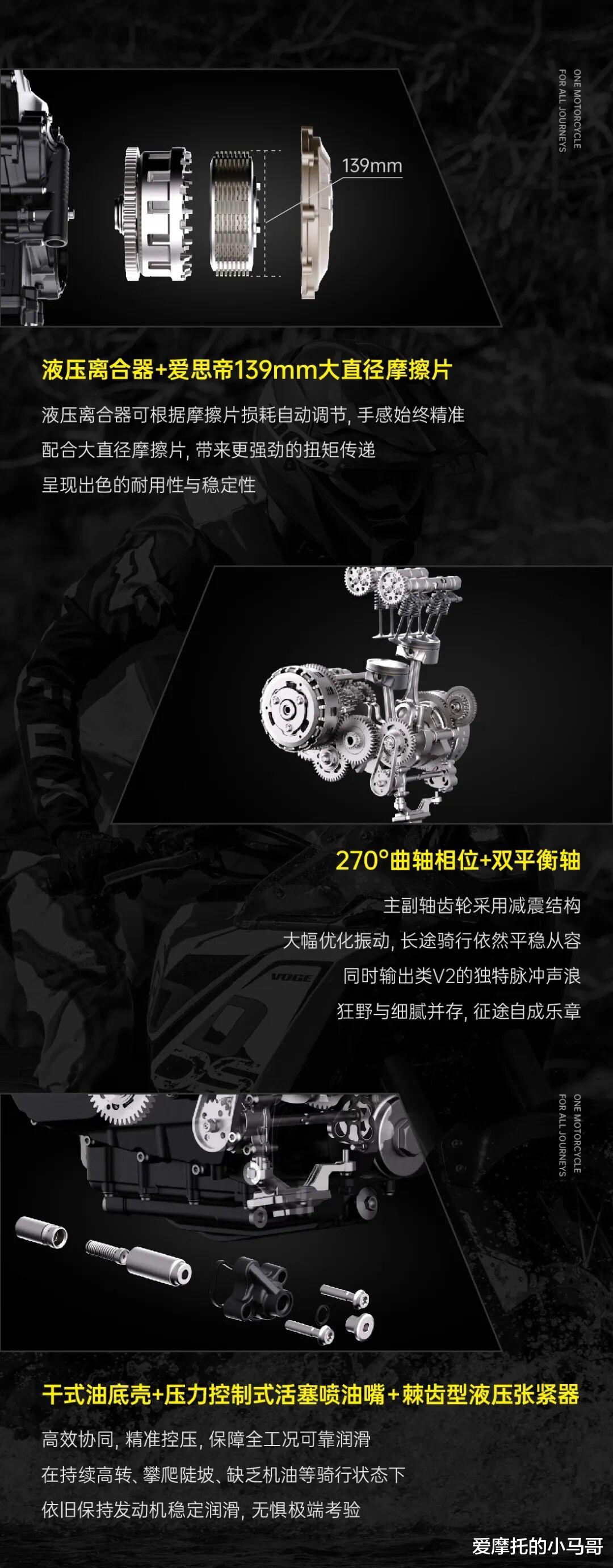 不同于同级竞品偏重激进输出却忽略运转品质的调校,无极的这台发动机因为270°曲轴的设计,能够更好的兼顾低扭爆发力与高速延展性,如此一来低速越野时油门细腻可控,不会出现突兀的动力闯动,新手也能轻松拿捏;高速巡航时动力储备充沛,120km/h巡航依旧游刃有余,超车给油就走,全程没有乏力感。